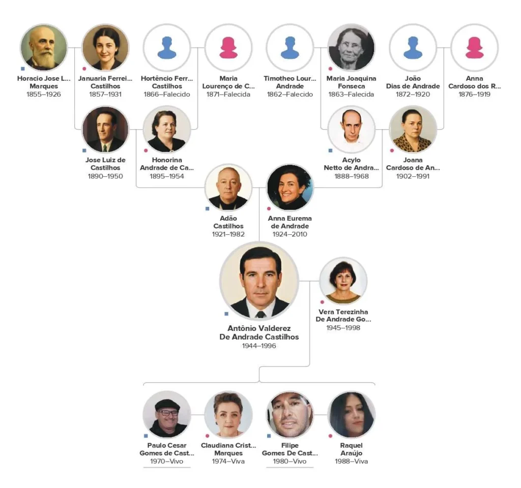 Horacio Jose Luiz Marques*04/03/1855 + 04/01/1926 e Januaria Ferreira de Castilhos *19/03/1857 + 25/11/1931. E Hortêncio Ferreira de Castilhos *22/04/1866 +(...) e Maria Lourenço de Castilhos *13/06/1871 +(...), eram seus bisavós paternos. Hotêncio e Maria casaram 01/04/1889 em Vacaria, RS. Januaria e Hortencio eram primos em 1º grau. Januaria era filha de José Ferreira de Castilhos, o Cazuza Ferreira *1826 + 13/05/1901 que era imão de João Ferreira de Castilhos *1823 +(...) pai de Hortêncio.